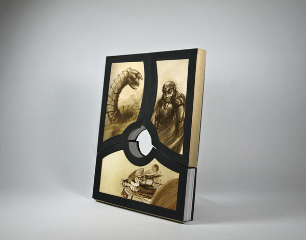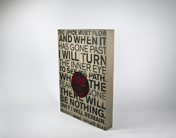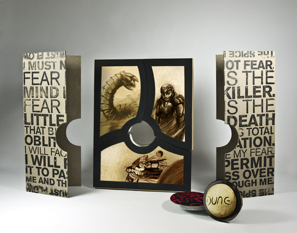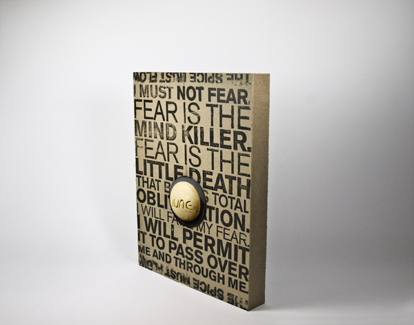 Chaque livre serait alors connecté aux autres magnétiquement. Ils sont tous trois reliés au centre, représenté par la sphère en métal, la planète Arrakis. Inutile de rappeler l’importance de cette planète dans ces ouvrages. Une bonne idée donc.