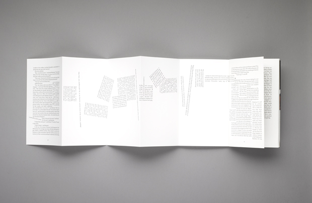 Maintenant que le décor est planté, intéressons nous plus en détails à cet ouvrage. Le graphiste Frith Kerr, a été chargé de s’occuper de ce livre. Il a basé son raisonnement autour du concept de digression. C’est donc ainsi, qu’au fur et à mesure du texte, la mise en page est de plus en plus surprenante. Des pavés de texte viennent croiser le texte courant et les lignes dessinent des formes géométriques. Plus le raisonnement de l’auteur devient fou, plus la mise en page le devient également.