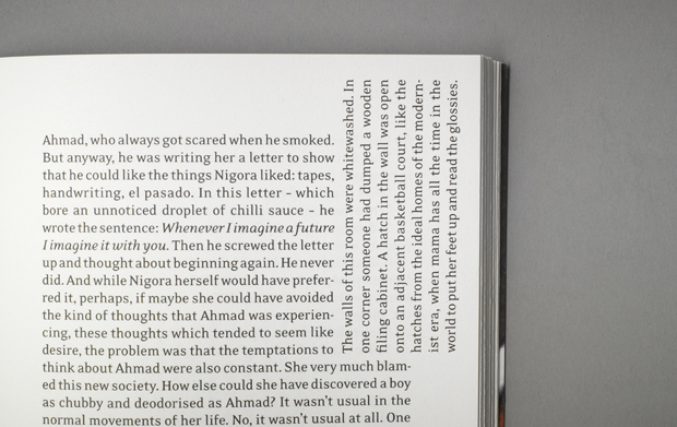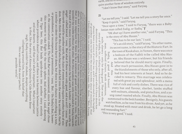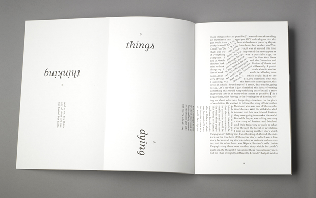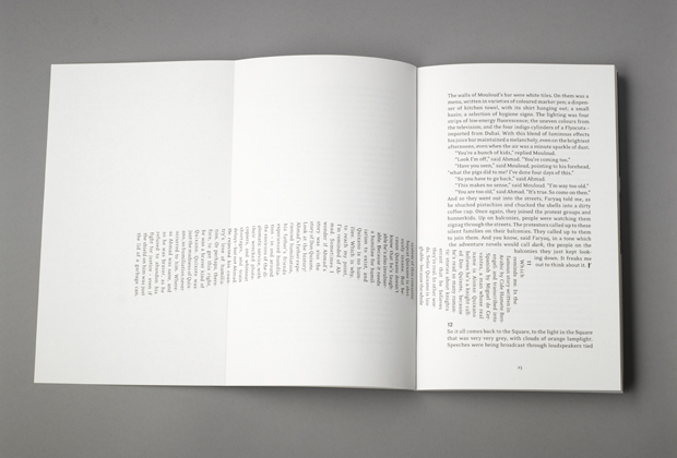 Visual Editions, déjà éditeur d’ouvrages magnifiques sur la forme vient de réaliser son quatrième livre, Kapow! d’Adam Thirlwell. Le roman parle d’un auteur anglais qui observe et retranscris les évènements du printemps arabe, en passant la majeur partie de son temps à digresser vers d’autres sujets.