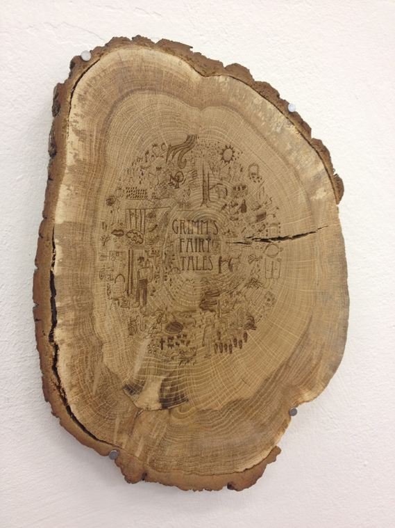 Dans un premier temps, elle a réalisé l’illustration de couverture avec le style qui lui est propre. Ensuite, afin de donner un côté plus authentique à son travail, elle a utilisé un laser pour la transférer sur une souche d’arbre. Pourquoi une souche me direz-vous ? D’après elle, il s’agit de faire le lien avec l’omniprésence des forêts dans les différents contes des frères Grimm.