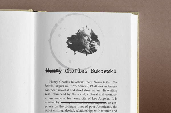 Aujourd’hui, mis en lumière du travail du graphiste italien Valentino Borghesi, encore étudiant, et qui a réalisé un travail autour des œuvres de Charles Bukowski.