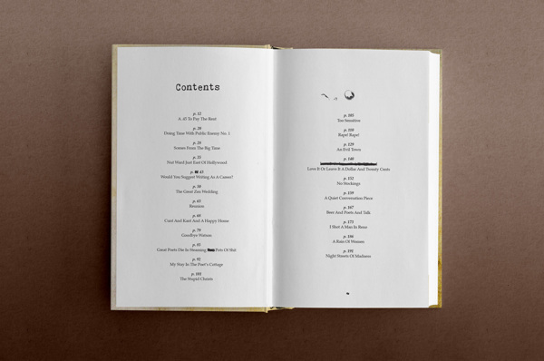 A partir de ce constat, il a choisi d’illustrer Notes of a dirty old man, Tales of ordinary madness, Confessions of a man insane enough to live with beasts et Erections, ejaculations, exhibitions and general tales of ordinary madness avec des bouteilles d’alcool. Du whisky, du rhum, du vin et de l’absinthe, un principe graphique identique avec une typo faite à la main pour créer une identité à la collection.