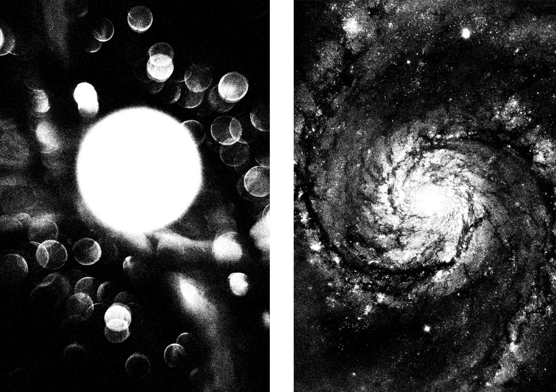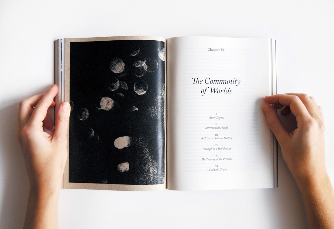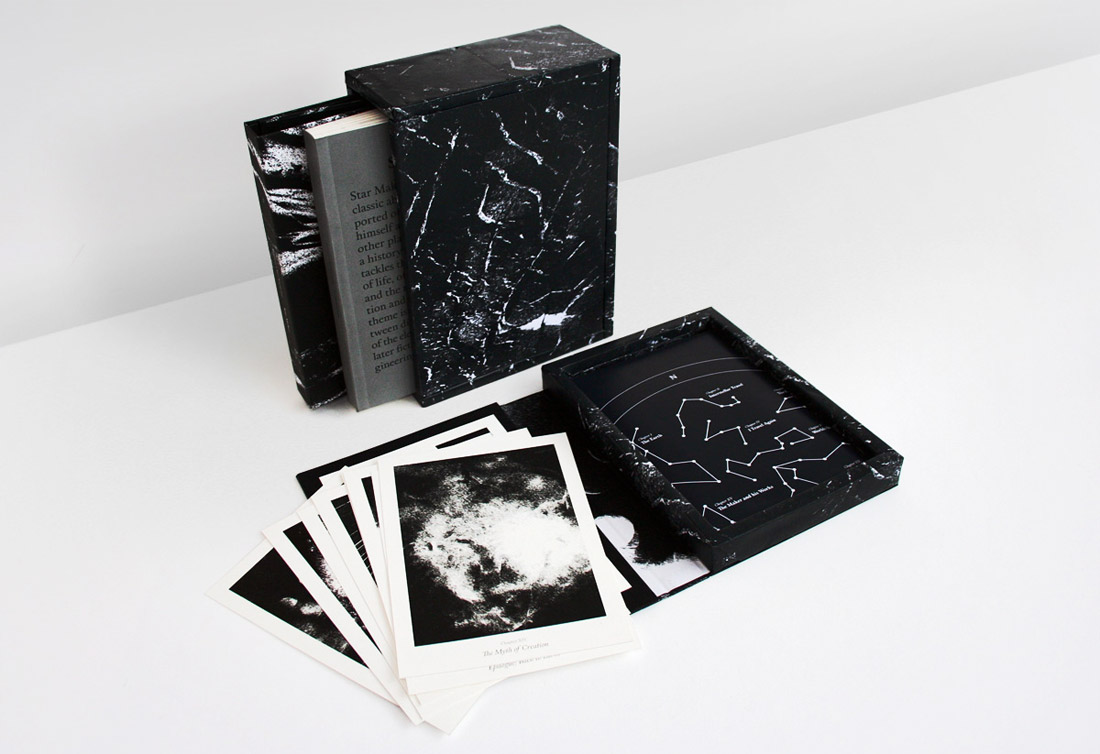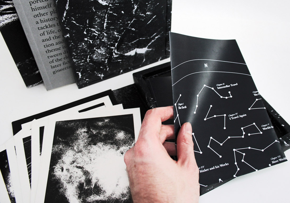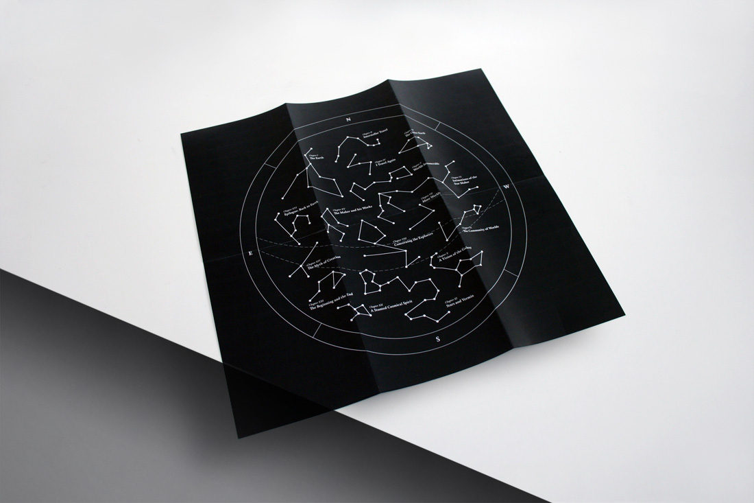 Le livre a été conçu avec différentes sortes de papier et est contenu dans une boîte, regroupant 16 oeuvres au format A5, représentant une interprétation visuelle de chaque chapitre. On y trouvera également une carte des constellations évoquées dans l’ouvrage, voyez plutôt :