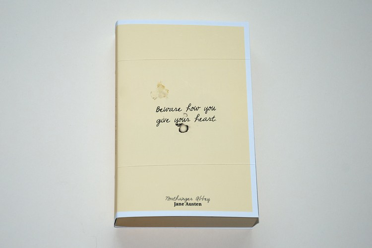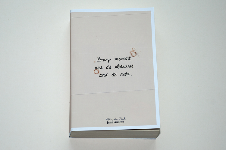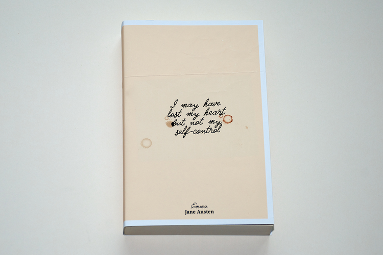 Son idée ? Rien de plus simple, et de plus percutant ! Pour les six ouvrages auxquels elle s’est intéressée, elle a extrait une citation de chacun et l’a apposé sur la couverture. Graphiquement, elle a imité l’écriture de Jane Austen. De cette façon, avec l’ajout de larme, de papier légèrement froissé, on peut imaginer que c’est le brouillon de l’auteur, que ce sont les traces de ses émotions en couverture. Rebecca tient bien à préciser que ce peut également être des larmes de joie.