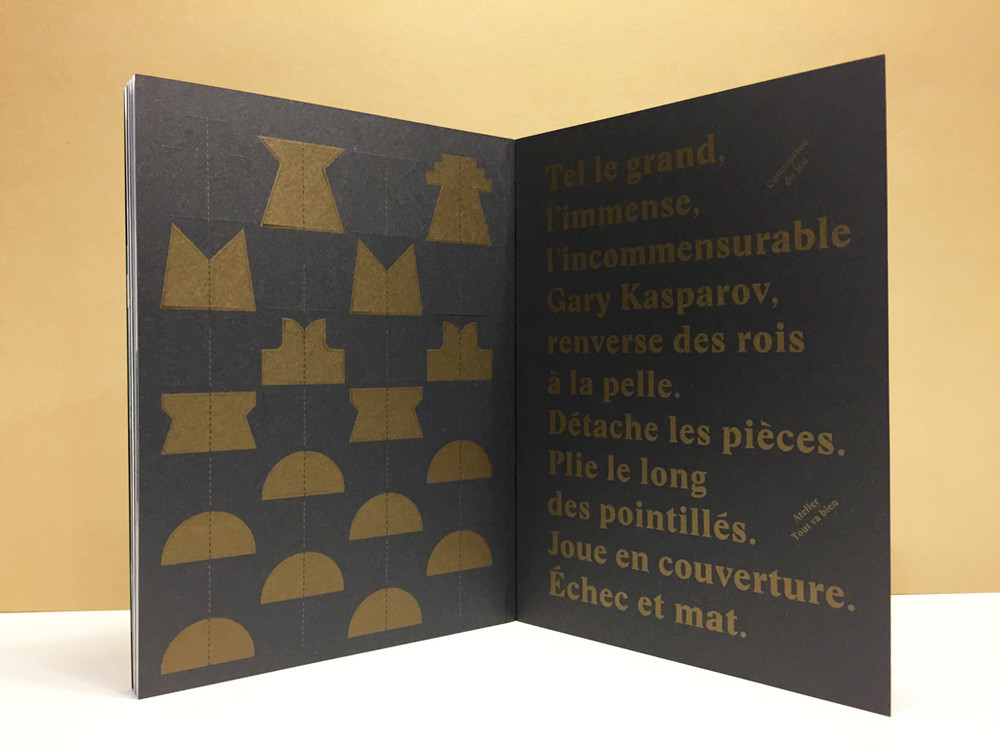 Quoi qu’il en soit, pour le numéro 52, ce sont les échecs qui sont mis à l’honneur. Derrière ce travail, c’est l’Atelier Tout Va Bien qui se cache, particulièrement les deux graphistes dijonnais Anna Chevance et Mathias Reynoird. Une fois le magazine ouvert, on découvre des pièces de jeu à découper et à plier pour pouvoir entamer une partie… sur la couverture !